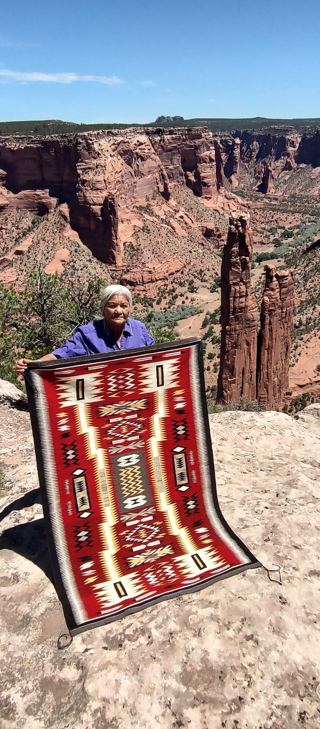 Elsie Bia's Ganado masterpiece is pure artistry in motion! This award-winning weaver has crafted a truly captivating work using 100% hand-dyed, custom-spun Churro wool that brings the classic Ganado pattern to vibrant life. Woven with the spirit of Canyon de Chelly—where Elsie herself stands before the sacred Spider Rock—this rug carries the ess...